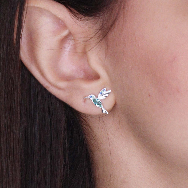 Brinco de Prata Beija Flor Coleção Florescer Zircônia Verde Água 14x10mm